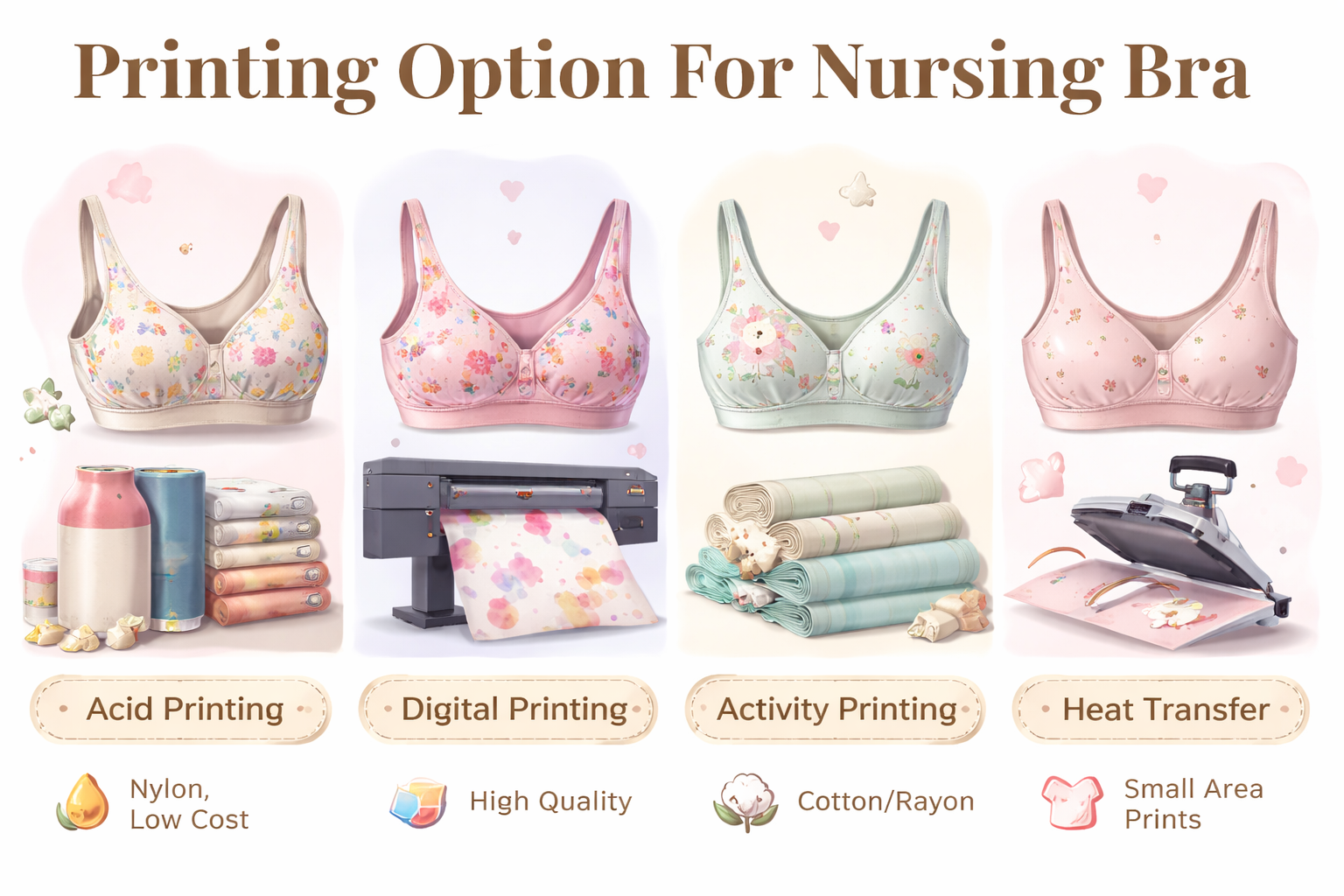 Heat transfer digital print-more suitable for small area prints, with large area will lead to stretching more tough cause of the sticky texture. Suit for nursing bra no need good stretching.